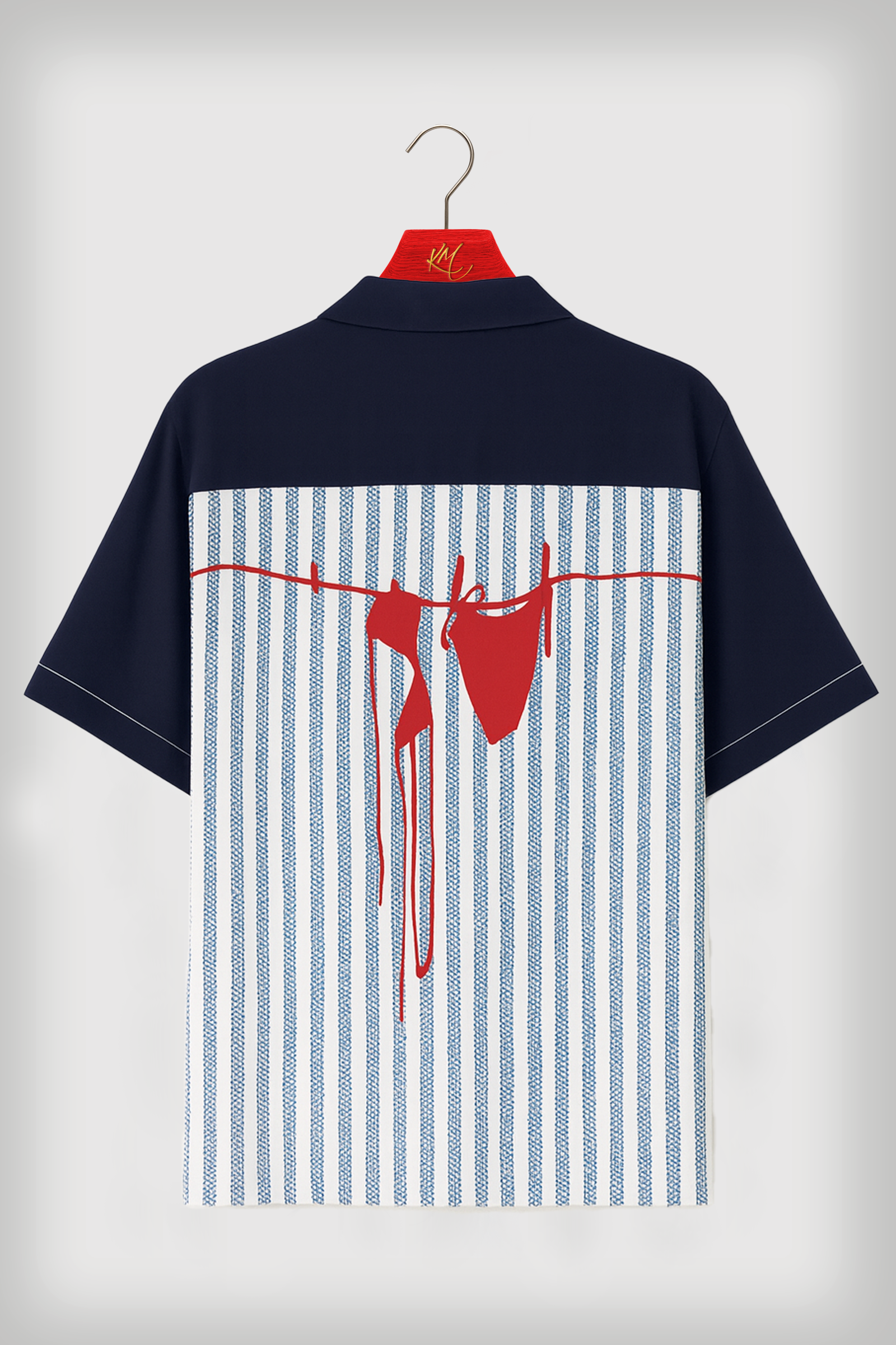 A love letter to Curaçao’s sun-drenched horizons, the Fuikday Buttoned Shirt is crafted in a deep-blue satin that moves like water under Caribbean light. The back panel reveals a contrast cotton fabric, patterned in soft white-and-blue stripes and adorned with a whimsical bikini-on-a-line illustration, a poetic nod to beach days that linger long after sunset.